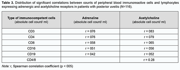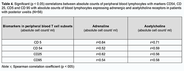 Results: Absolute and relative adrenoreceptor and acetylcholine receptor expression levels in patients with posterior uveitis were 1.8-2.0 times and 1.6-2.4 times, respectively, higher in patients with posterior uveitis compared to controls. Absolute adrenoreceptor and acetylcholine receptor expression values were 12.6% and 31.7%, respectively, higher in the recurrent process during active inflammation compared to the period of remission. However, in patients with posterior uveitis, adrenoreceptor and acetylcholine receptor expression values in the period of remission were still higher than normal values. The odds of an increased relative adrenoreceptor expression and the odds of an increased relative acetylcholine receptor expression on peripheral blood lymphocytes were 67.5-fold higher and 23.6-fold higher, respectively, among patients with posterior uveitis compared to controls. The correlation of adrenoreceptor expression and acetylcholine receptor expression with absolute counts of T cells and T helpers was stronger than the correlation with B cells, which reflects to a larger extent the association with the cellular immunity and to a lesser extent the association with the humoral immunity. There was a moderate correlation of adrenoreceptor expression and acetylcholine receptor expression with cell subsets of markers of early lymphocyte activation CD5, autoimmune aggression CD25, intercellular adhesion CD54 and apoptosis CD95 (Fas/APO-1).