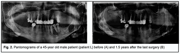 Facial skin was clear and of a normal color. Submandibular, submaxillary, submental and neck lymph nodes were not enlarged. Mandibular motility was within normal limits. The mucosa of the oral vestibule and oral cavity was moderately moist and pale pink. In the adult patients, there was anodontia of the mandible and maxilla. Prostheses were used to restore the integrity of dentitions and normal occlusion. The children had late mixed occlusion. In the adult patients, no malformation was found on palpation of the alveolar processes of the jaws at both sides. In both children, dome-shaped malformations of the vestibular lamina of the maxilla at the areas of lesions were found on palpation. In addition, in one the boys, malformation in the post-operative site on the mandible was found on palpation. Both adults underwent their last surgery 5 to 7 years before, with their pantomograms showing anodontia of the lateral mandible and maxilla. Heterogeneous bone density with poorly delineated post-operative areas of restored bone tissue prevailed. In the man, the X-ray at 1.5 years after surgery showed a well-defined cyst-like mass in the right mandibular ramus, close to the condylar neck, with the mass showing no progression compared to previous X-rays (Figure 2).