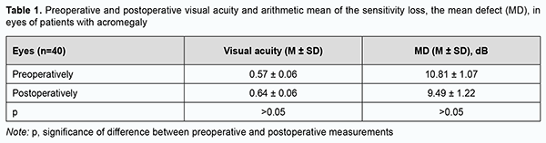 Material and Methods: We retrospectively reviewed the medical records of 174 patients with newly diagnosed acromegaly who underwent endoscopic transnasal transsphenoidal surgery for PA at the Transsphenoidal Neurosurgery Department of the Romodanov Institute during 2018 through 2011. In all patients, the diagnosis of PA was confirmed by a comprehensive morphological study. Of the 174 patients, 11.5% (20 patients; 40 eyes) had visual disturbances (reduced visual acuity and/or visual field defects) and were included in the visual disturbance group. Patients underwent clinical and neurological, endocrinological and eye examination and neuroimaging studies.