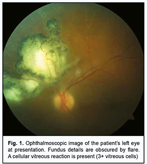 Introduction Clinical management of eye patients with severe recurrent ocular lesions from opportunistic infections is a challenge because it requires close cooperation of a wide range of medical specialties for identification of the infectious agent, rational assessment of the immune status, search for the cause of immunosuppression, and delivery of comprehensive therapy that would include not only measures to suppress microbial infection but also those to compensate for an immune dysfunction that has caused reactivation of latent or persistent infection in the human body. Toxoplasma gondii is a typical opportunistic agent which is re-activated in the body of an immunocompromised individual with a primary or secondary immunodeficiency, and can cause severe ocular lesions in humans. In their recent overview on clinical aspects of ocular toxoplasmosis, Fabiani and colleagues [1] noted that at least 30% of current population are seropositive for Toxoplasma gondii, and it is in this cohort of individuals that severe ocular lesions can develop if the parasite reactivates under conditions of immunosupression. Kalogeropoulos and co-authors [2] have reviewed recently the current diagnostic and therapeutic approaches to Toxoplasma gondii, and reported that, although the prevalence has somewhat decreased over a recent decade, the agent is still a major cause of posterior uveitis in individuals with low immunity, which manifests itself as vitritis and chorioretinitis. Because cases of severe ocular toxoplasmosis infection have been reported mostly in patients with HIV infection [3, 4], malignancies [5] and primary immunodeficiency [6], immune status assessment is essential for a rational differential diagnostic approach in clinically manifest toxoplasmosis in humans. Our literature review found that reports on the reactivation of toxoplasmosis in immunocompetent individuals are extremely rare [7]. In this paper, we describe a case of recurrent toxoplasmic chorioretinitis in cellular immunodeficiency and demonstrate the importance of assessing for the immune status and selecting the targeted immunotherapy for removing the signs of immunosuppression in toxoplasmosis. The patient signed informed consent regarding participation in the study and the processing of personal data. The study adhered to the Declaration of Helsinki. Case report A 37-year-old male presented to an ophthalmologist with complaints of reduced visual acuity and discomfort in his left eye. He had a history of at least two episodes of acute posterior uveitis without identifying the cause of inflammation and, consequently, without administering a causal medical therapy and addressing the underlying etiology. The patient reported that those episodes had been treated with non-specific corticosteroid anti-inflammatory therapy in the form of periocular injections and topical eye drops. On eye examination at presentation, Snellen visual acuity in the right eye was 20/20. There was no biomicroscopic or ophthalmoscopic evidence of active inflammation in the right eye. Ophthalmoscopically, the right optic disc appeared pale pink with clear margins. Macular reflex was clear, and the macular region showed no pathological changes. There was a white lesion measuring 0.1 disc diameter with clear pigmented margins in the temporonasal paramacular region. The vitreous above the lesion showed no pathological changes. At presentation, Snellen visual acuity in the left eye was 20/100. Biomicroscopy of the left eye showed clear aqueous and no cells or fibrinous effusion in the aqueous. Papillary reaction to light was normal. Ophthalmoscopy of the left eye showed an inflammatory cell response and floating clumps of inflammatory cells in the vitreous body (Fig. 1).