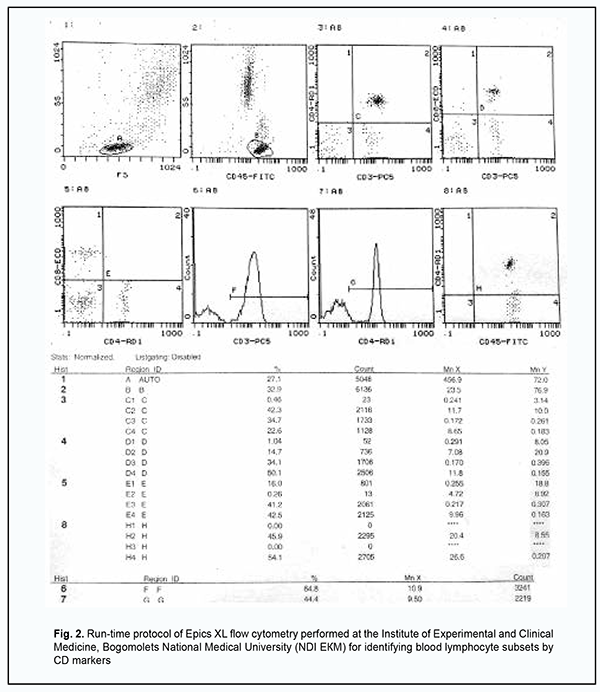 In the peripapillary region there were white retinal lesions (measuring as much as 7-8 disc diameters totally) with sharp pigmented margins (Fig. 1). In addition, below these lesions, there was a peripapillary white lesion with blurred margins and increased cell infiltration above the lesion area. White perivascular sleeves surrounding the lesion were observed in the retina. These ophthalmoscopic findings were interpreted according to Stokkermans and Havens in their recent study on human Toxoplasma retinochoroiditis [8]. Blood white cell PCR and eye swab PCR with specific primers for herpes simplex virus (HSV) 1/2, Varicella-zoster virus (VZV) , Epstein Barr virus (EBV), Cytomegalovirus (CMV), human herpesvirus (HHV)-6, HHV-7, HHV-8, adenoviruses, enteroviruses, torque teno virus (TTV), B19 parvovirus, hepatitis В, С, D and G, T. gondii, Borrelia burg., Chlamydia pneum., and Mуcoplasma pneum were performed at the Neurobiochemistry Laboratory of the Romodanov Neurosurgery Institute to find the cause of acute chorioretinitis that was believed to be recurrent given the old chorioretinal scars in both eyes. All PCR tests were negative. Serum levels of specific IgM and IgG to the above microbial agents were determined at the Neurobiochemistry Laboratory. Serological studies identified increased serum levels of specific IgG to T. gondii (324 IU/ml against a normal value of N˂10 IU/ml) and CMV (84 IU/ml against a normal value of N˂10 IU/ml), but not to other causative agents. At this time point, serum levels of specific IgG to T. Gondii were found to be increased more than fourfold (324 IU/ml against 63 IU/ml), whereas those to CMV, were found not to change substantially (84 IU/ml against 76 IU/ml), compared to 3 months before (the time point of previous exacerbation of ocular pain). Therefore, paired serology confirmed a Toxoplasmic etiology, but not a CMV etiology of acute chorioretinitis in the left eye. Zhang and colleagues [9] overviewed the serological diagnosis of toxoplasmosis, including diagnostic strategy, current problems in detection with specific antibodies, and the standardization of T. Gondii serological detection. They reported that, in the clinic, the serological detection of IgМ and IgG antibody levels are the basis for identifying infection and the most commonly used methods. Particularly, the identification of specific IgM antibodies or evidence of an increase in the titer of specific IgG antibodies over a short period after initial testing indicates reactivation of the pathogen. Chan and colleagues [10] reported on the results of a National Serosurvey in Haiti, and concluded that multiplex serological assays can provide a wealth of information about population exposure to different infectious diseases including toxoplasmosis. Borges and co-authors [11] compared the detection of immunoglobulin isotypes and subclasses against Toxoplasma gondii soluble antigen in serum and colostrum samples from puerperal women, and reported that serum and colostrum immunoglobulins of different classes and subclasses provide a wealth of information about exposure to toxoplasmosis. A recent case-control study by Babekir and colleagues [12] evaluated the association of T. gondii infection and liver disease, and found serum T. gondii IgG+ antibody to be significantly associated with liver injury biomarkers and an increased risk of chronic liver disease and nonalcoholic fatty liver disease, demonstrating the value of serological tests in toxoplasmosis. Because Toxoplasma infection is caused by an opportunistic agent which is reactivated from latency or persistent infection mostly under conditions of immunosuppression, we believed it was reasonable to assess the immune status of the patient in order to elucidate a causative immunodeficiency. Another reason for this belief was that, in the case reported here, the presence of old chorioretinal scars in both eyes was consistent with the recurrence of toxoplasmic chorioretinitis. Immunological evaluation included complete blood cell count and lymphocyte subpopulation analysis by flow cytometry on a Beckman Coulter Epics XL flow cytometer (Beckman Coulter, Miami, Fla.) and indirect immunofluorescence with monoclonal antibodies to CD markers with two or three immunofluorescent labels (CD3+ (N = 54–83%), CD3+CD4+ (N = 26–58%), CD3+CD8+ (N = 21–35%), CD3–CD19+ (N = 5–14%), CD3–CD16+CD56+ (N = 5–15%), CD3+CD16+CD56+(N = 3–8%)) and calculation of the immunoregulatory index (N = 1.2 – 2.3) (reagents from Beckman Coulter). The run-time protocol of Epics XL (Epics XL- Flow Cytometer; Beckman Coulter Inc., Brea, CA) flow cytometry for identifying blood lymphocyte subsets by CD markers is presented in Fig. 2).