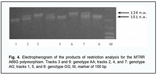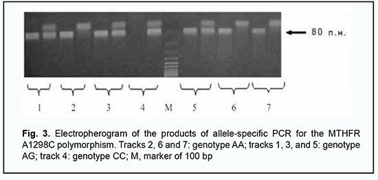 Functional T cell activity was assessed by concanavalin A-induced T cell blast transformation (N = 1.2 – 1.68 optical units). Phagocytosis was assessed by latex bead ingestion with the determination of the phagocytic index (N = 1.5–3.0 units) and by the myeloperoxidase activity (ELISA, N = 18–23 units) and NADPH oxidase activity of neutrophils (nitroblue tetrazolium test; spontaneous activity, N = 80–125 units; induced activity, N = 150–380 units). Serum levels of major immunoglobulin classes were determined by enzyme-linked immunosorbent assay (ELISA) (VektorBEST, Russia; N IgM = 0.8–1.6 g/L, N IgA = 0.6–2.5 g/L, N IgG = 6.0–15.0 g/L). Serum levels of minor IgE (N = 30–100 IU/mL), IgD (N ˃ 13 IU/mL) and IgG (N IgG1= 280–1120 mg per scale division, N IgG2 =30–630 mg per scale division, N IgG3 = 40–250 mg per scale division, N IgG4 = 11–620 mg per scale division) immunoglobulin classes were determined by ELISA (VektorBEST, Russia; MDI Limbach Berlin GmbH, Germany). The results of a complete blood cell count indicated absolute lymphocytosis and monocytosis and relative neutropenia in the presence of a normal blood sedimentation rate. We found that, of the immune status biomarkers assessed, only the counts of CD3+CD16+CD56+ T-cell (natural killer T-cell) and cytotoxic СD8+ T-cells were not within the reference ranges; particularly, they were almost less than half of the low limit of the normal range (1.4%; 0.02 х 109/L and 12%; 0.08 х 109/L, respectively). To further validate our findings, we randomly repeated immunological studies and obtained similar results (1.3%; 0.04 х 109/L and 13%; 0.09 х 109/L, respectively) to initial studies. Therefore, we identified a selective deficiency of NK T-cells and cytotoxic СD8+ T-cells. These findings are in agreement with the current ideas on the mechanisms of immune surveillance of T. gondii, with a subset of cytotoxic NK T-cells having been attributed a key role in an effector immune response to the opportunistic pathogen [13]. The results of at least three recent reviews of clinical studies on immune protection in human toxoplasmosis have demonstrated key importance of cytotoxic СD8+ and NK T-cells in the control over the latent Toxoplasma in the human body [14, 15, 16]. It was obvious that deficiency of NKT cells and cytotoxic СD8+ T cells and was the most likely cause of a critical impairment in immune surveillance of endogenous T. gondii and the development of T. gondii-induced acute chorioretinitis. However, the question of the origin of the above cellular immunodeficiency in our patient was still open. The patient’s history and additional studies gave no evidence of such common causes of secondary immunosuppression as HIV infection, endocrine disorder, malignancies and taking immunosuppressive medications. We had to exclude primary immunodeficiency whose laboratory phenotype could include deficiency of NKT cells and cytotoxic СD8+ T cells. For this purpose, Primary Immunodeficiency (PID) panel (Centogene, Rostock, Germany) was employed, including studies of nucleotide variants of more than 208 genes associated with well-known human primary immunodeficiencies. Since these genetic studies were negative, we retrospectively analyzed the results of all the available biochemical studies that the patient had undergone throughout his life. In this way we found a characteristic pathologic phenomenon, hyperhomocysteinemia (i.e., pathologically increased serum homocysteine levels); this was seen in the results of numerous studies which the patient had undergone. Thus, the patient’s serum homocysteine levels varied from 11.6 µMol/L to 19.1 µMol/L against a normal value of < 8 µMol/L. This finding supposed a genetic folate cycle deficiency, because hyperhomocysteinemia is a characteristic laboratory finding of this genetic disorder [17, 18]. Consequently, the patient had a special genetic testing at the Neurobiochemistry Laboratory of the Romodanov Neurosurgery Institute to identify pathologic polymorphisms in the genes coding for folic acid cycle enzymes, MTHFR C677T (rs1801133), MTHFR A1298C (rs1801131), MTRR A66G (rs1801394) and MTR A2756G (rs1805087). The genetic testing identified two pathogenic polymorphisms in the genes coding for folic acid cycle enzymes (heterozygous MTHFR A1298C and homozygous MTRR A66G), which was consistent with the condition of persistent hyperhomocysteinemia, and confirmed the presence of a genetic folate cycle deficiency in the patient. The results of restricted PCR for pathogenic polymorphisms in MTHFR and MTRR genes are presented in Figs. 3 and 4.