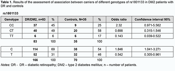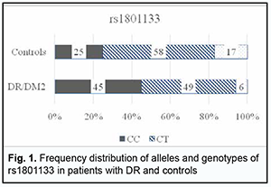 Introduction Diabetic retinopathy (DR) is still a major cause of loss of vision in working-age adults, so the problem is still relevant. Research is underway on all pathogenetic components of microvascular complications of type 2 diabetes mellitus (DM2), from systemic effects of nutritional factors, lifestyle, generic susceptibility, and impaired molecular mechanisms of lipid metabolism resulting in metabolic changes and leading to aggravation of DM2, to molecular mechanisms of biochemical effects of hyperglycemia, oxidative stress, impaired homeostasis, and changes in gene transcription associated with oxidative stress, increased endothelial apoptosis, and the role of mitochondrial dysfunction [1-3, 4]. However, in spite of advances in this field, the molecular mechanism of the multifactorial disease is still poorly understood [4, 5]. Experimental and clinical studies demonstrated that patients with DM2 and animals with experimental diabetes have increased levels of homocysteine both in blood and tissues [6-8]. An elevated homocysteine level is a dangerous factor and results in the development of endothelial dysfunction and microvascular complications (retinopathy, nephropathy, cardiomyopathy, and neuropathy), because high homocysteine causes structure damage to endothelial cells and disruption of the blood brain barrier, resulting in retinal ischemia and neovascularization, increased vascular endothelial growth factor (VEGF), and activation of endoplasmic reticulum stress and oxidative stress [9-12]. Homocysteine is a potential biomarker and a potential therapeutic target for DR [9]. Hyperhomocysteinemia is frequently associated with age and physiological features, and individual genetic, epigenetic and nutritional risk factors. The major cause of homocysteine accumulation is, however, missing or dysfunctional enzymes and cofactors (water-soluble vitamins B1, B2, and B3) associated with homocysteine metabolism, especially in the elderly [7, 8]. It is for this reason that the potential association of methylenetetrahydrofolate reductase (MTHFR) C677T and A1298C, and methionine synthase (MTR) A2756G polymorphisms of folate cycle enzymes with the risk for hyperhomocysteinemia has been studied. There have been reports describing nervous system abnormalities (including brain tissue inflammation) which result in the development of Alzheimer’s disease, Parkinson’s disease and child autism spectrum disorder, the disorders based on the genetically determined deficiency of folate cycle enzymes [13,14]. However, there is no agreement on whether there is an association between polymorphisms of the above genes and diabetic retinopathy in DM2. There have been reports on the association of MTHFR (677C/T) and DR in Asian populations [15-17]. There is also no agreement on whether these polymorphisms are associated with the development and progression of DM2 and its complications [8, 18, 19]. The purpose of the study was to assess the role of polymorphisms of folate cycle enzymes (MTHFR C677T, MTHFRA 1298C, MTRA 2756G) in DR progression in patients with DM2. Material and Methods Eighty-three DM2 patients with different stages of DR were included in the study. Stages of DR were determined using the early treatment diabetic retinopathy study (ETDRS) scale. This allowed dividing patients into two groups that were substantially different in terms of the severity of lesions, the group (43 patients, 43 eyes) including patients with mild, moderate or severe non-proliferative DR (NPDR), and the group (40 patients, 40 eyes) including patients with mild, moderate or severe proliferative DR (PDR). The control group was composed of 35 patients without DM2 who had no diagnosed metabolic abnormalities and presented for preventive examination to the Clinical and Diagnostic Laboratory of the university clinic of Bogomolets National Medical University. Approval for the study was obtained from the Bioethics Committee, the Shupik National Healthcare University of Ukraine. The procedures followed were in accordance with the ethical standards of the Helsinki Declaration (1964, amended most recently in 2008) of the World Medical Association. Informed consent was obtained from all patients. Patients underwent an examination as per the ETDRS protocol including visual acuity assessment, refractometry, static Humphrey perimetry, tonometry, and biomicroscopy. In addition, gonioscopy, ophthalmoscopy with contactless aspheric lenses and a Goldmann contact lens, and macular optical coherence tomography (Topcon DRI OCT Triton, Tokyo, Japan) were performed, if required. Moreover, a fundus camera was used to examine the retina. Thyroid hormone levels were measured to exclude the presence of hormonal abnormality. Molecular and genetic studies were performed using standard techniques at the certified laboratories of the Bohomolets NMU Research Institute for Experimental and Clinical Medicine. Plasma L-homocysteine levels were determined using an enzyme-linked immunosorbent assay (ELISA) microplate reader (Rt2100c; Rayto Life and Analytical Sciences Co. Ltd, Shenzhen, China), PST-60HL-4 microplate thermo-shaker (Biosan, Riga, Latvia), PW40 plate washer (Bio-Rad® Laboratories) and Axis® Homocysteine Enzyme Immunoassay (EIA) kit (AXIS-SHIELD Diagnostics Ltd, Dundee, Scotland, UK, Cat No. FHCY100). A venous blood sample was collected and transferred into a 4-ml K3 ethylenediaminetetraacetic acid (EDTA) blood collection tube in the laboratory procedure room. After centrifugation, the plasma was transferred to an Eppendorf tube for ELISA measurements, and the precipitated cell layer was stored at −20 °C until genetic analysis. Genomic DNA was extracted using PureLink® Genomic DNA Kits for purification of genomic DNA (Invitrogen Corp., Carlsbad, CA, USA). At the first phase, an aliquot of precipitated cells was incubated with proteinase K, RNase A and digestion buffer at 55°C for 10 minutes for cell lysis and RNA destruction. Centrifu