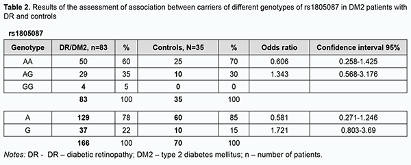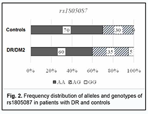 Among the controls, the heterogenous CT genotype was most common with 58%, followed by the CC (25%) and TT (17%). Among the patients, the heterogenous CT genotype was also most common, but the percentage was smaller than in the controls (49 versus 58%) at the expense of an increased percentage of the CC genotype (45%). In addition, the percentage of TT genotype was substantially smaller in patients compared with controls. Therefore, the rs1801133 СС genotype is more associated with the disease than the rs1801133 TT genotype. Odds ratios (ORs), standard error of the odds ratio (S) and 95% confidence interval (CI) were calculated to determine the relative strength of the associations (Table 1). OR values were 2.32 (95% CI, 0.971-5.562; P > 0.05) for the CC genotype, 0.698 (95% CI, 0.315-1.546; P > 0.05) for the CT, and 0.143 for the TT (95% CI, 0.039-0.522; P > 0.05). In patients, the C allele (69%) was two times more frequent than the T allele, whereas in controls, the former allele was just slightly more common than the latter allele, with OR values of 1.846 (95% CI,1.041-3.275; P > 0.05), and 0.542 (95% CI, 0.305-0.961; P > 0.05), respectively. Therefore, there was no evidence of association of rs1801133 with DR in DM2 compared to individuals without diabetes. Analysis of rs1805087 polymorphism association with DR showed (Fig. 2, Table 2) that, among the controls, the major AA genotype was more common than the heterogeneous AG genotype (70% versus 30%, respectively).