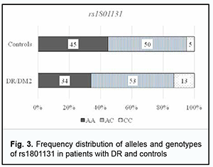 Among the patients, the AA genotype was also most common (60%), followed by the AG (35%) and GG (5%). In the comparison of polymorphism frequencies between patients and controls, OR values were 0.606 (95% CI, 0.258-1.425; P > 0.05) for the AA genotype and 1.343 (95% CI, 0.568-3.176; P > 0.05) for the AG. The A allele was most common among patients and controls, and almost 3.5-fold more common than the G allele in patients, and 5.6-fold more common than the G allele in controls. OR values were 0.581 (95% CI, 0.271-1.246; P > 0.05) for the A allele and 1.721 (95% CI, 0.803-3.69; P > 0.05) for the G allele. Therefore, there was no evidence of association of rs1805087 with DR in DM2. Analysis of rs1801131 polymorphism association with DR in DM2 showed (Fig. 3, Table 3) that, among the controls, the AC genotype was most common (50%), followed by AA (45%) and CC (5%) genotypes. The pattern of distribution of these genotypes among patients was similar to that in controls, with the AC genotype being most common (53%), followed by AA (34%) and CC (13%) genotypes. OR values were 0.605 (95% CI, 0.27-1.353; P > 0.05) for the AA genotype, 1.195 (95% CI, 0.542-2.634; P > 0.05) for the AC, and 2.521 for the CC (95% CI, 0.529-12.02; P > 0.05). The A allele was most common among patients and controls, it was 2.3-fold more common than the C allele in patients, and 1.5-fold more common than the C allele in controls. OR values were 0.667 (95% CI, 0.37-1.203; P > 0.05) for the A allele and 1.5 (95% CI, 0.832-2.706; P > 0.05) for the C allele.