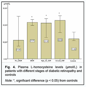 Therefore, there was no evidence of association of rs1805087, rs1805087, and rs1801131, important polymorphisms of folate cycle enzymes, with DR in DM2. Given potential effects of high plasma L-homocysteine levels on the development of vascular dysfunctions and properties and state of the endothelium, particularly in the presence of hyperglycemia, we assessed median [interquartile] levels of plasma L-homocysteine in DR patients with DM2 and controls. We found that median [interquartile] levels of plasma L-homocysteine were twice higher in patients compared to controls, 21.12 µmol/l (15.41-24.57) versus 11.85 µmol/l (10.63-16.96), respectively, and this difference was significant (р < 0.05). In addition, there was only a slight difference in median [interquartile] levels of plasma L-homocysteine between patients with NPDR and those with PDR, 20.86 µmol/l (15.09-25.15 versus 21.68 µmol/l (16.02-23.76). We subdivided the NPDR group into the Pre_NPDR (n=12) and moderate NPDR (n=21) subgroups, and the PDR group into the High_risk_PDR (n=20) and Advanc_NPDR (n=20) subgroups and compared the subgroups for median [interquartile] levels of plasma L-homocysteine. We found plasma L-homocysteine levels to increase already at the onset of NPDR, with median [interquartile] (Min-Max) levels of plasma L-homocysteine to be 11.0 µmol/l [9.11÷19.27] (7.56-25.15) for the Pre_NPDR subgroup and 11.85 µmol/l [10.6÷16.9] (6.57-25.89) for the controls, which reflects a substantial variation among patients. An increase in the severity from pre-NPDR to moderate NPDR was accompanied by an almost twofold increase in plasma L-homocysteine levels.