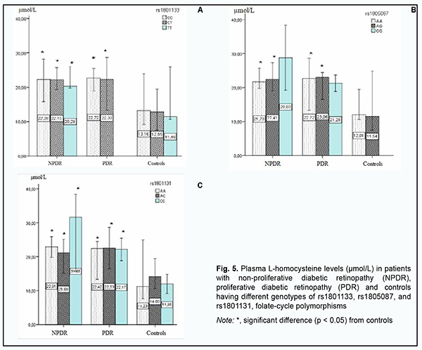 Therefore, although we found no association of the genetically determined deficiency of folate cycle enzymes with the risk of developing DR in DM2, plasma L-homocysteine level may be considered a marker of the development of microvascular DM2 complications, particularly, DR. Consequently, we believe it is important to keep searching for potential trigger factors for structural retinal damage and increased severity of retinopathy in patients with DM2. Fig. 5 shows the results of the analysis of plasma L-homocysteine level in DM2 patients with NDR or PDR depending on rs1801133, rs1805087, and rs1801131, genetically determined polymorphisms. Across all patient carriers of SNP rs1801133, there was a twofold increase in plasma L-homocysteine level (р < 0.05), with no substantial change in plasma L-homocysteine level with an increase in the severity of retinal damage. For carriers of AA or AG, the most common genotypes of rs1805087АА, plasma L-homocysteine levels were twofold higher in patients with NPDR or PDR compared to controls (р < 0.05), with no significant difference between groups of patients. However, it is interesting that, in NPDR patients having the minor GG genotype of rs1805087, plasma L-homocysteine levels were 1.3-fold higher than in NPDR patients having another genotype than GG, and 2.4-fold higher than in controls, and there was no significant difference in plasma L-homocysteine level between PDR patients having the GG genotype and PDR patients having another genotype than GG.