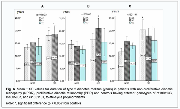 Given that there were no carriers of GG genotype among controls, we may hypothesize that this genotype is a potential trigger factor for structural retinal damage and increased severity of retinopathy in patients with DM2. A similar pattern was observed among carriers of rs1801131, with plasma L-homocysteine levels being twofold greater in carriers of AA or AC, the most common genotypes of rs1801131, compared to controls. In addition, in NPDR patients having the minor CC genotype of rs1801131, plasma L-homocysteine levels were threefold higher than in controls, and 1.4-fold higher than in NPDR patients with another genotype than CC. High plasma L-homocysteine levels in NPDR patients having the GG genotype of rs1805087 and/or the CC genotype of rs1801131 may be discussed as a potential mechanism of initiation of retinal damage, but the current study was limited by a small number of carriers of these genotypes, and this point requires further research. For further search of triggers of DR progression in DM2, groups of patients and variants of the genetically determined deficiency of folate cycle enzymes were compared for DM2 duration (Fig. 6). The mean diabetes duration was 13.6 ± 6.51 years for the NPDR group and 16.8 ± 6.47 years for the PDR group, with no significant difference between the groups. Since there was no significant difference between the NPDR and PDR groups with regard to mean DM2 duration or DR progression in the current study, we should search for other potential mechanisms that could predispose a patient to an increase in the severity of retinal damage.