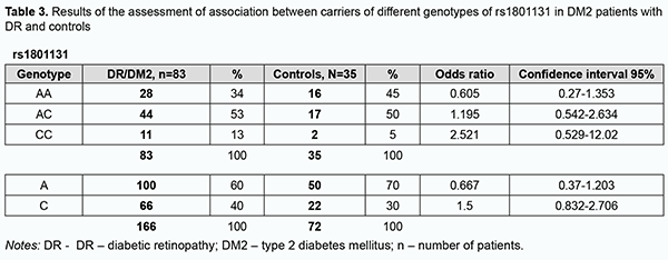 Finally, the duration of DM2 is an important factor of DR progression in carriers of the most common CC and CT genotypes of rs1801133, AG genotype of rs1805087, and АА genotype of rs1801131. References 1.Barrett EJ, Liu Z, Khamaisi M, et al. Diabetic Microvascular Disease: An Endocrine Society Scientific Statement. J Clin Endocrinol Metab. 2017 Dec 1;102(12):4343-4410. 2.Shi C, Wang P, Airen S, et al. Nutritional and medical food therapies for diabetic retinopathy. Eye Vis (Lond). 2020 Jun 18;7:33. 3.Natrus LV. A novel concept of differences in pathogenetic mechanism of diabetic retinopathy progression between type 2 diabetes mellitus patients differing in the PPARγ genotype. J Ophthalmol (Ukraine). 2020;5:36-42. 4.Kowluru RA. Diabetic Retinopathy: Mitochondria Caught in a Muddle of Homocysteine. J Clin Med. 2020 Sep 19;9(9):3019. 5.Kowluru, RA, Mohammad G, &Sahajpal N. Faulty homocysteine recycling in diabetic retinopathy. Eye Vis (Lond). 2020 Jan 10;7:4. 6.Malaguarnera G, Gagliano C, Giordano M, et al. Homocysteine serum levels in diabetic patients with non proliferative, proliferative and without retinopathy. Biomed Res Int. 2014;2014:191497. 7.Koklesova L, Mazurakova A, Samec M, et al. Homocysteine metabolism as the target for predictive medical approach, disease prevention, prognosis, and treatments tailored to the person. EPMA J. 2021 Nov 11;12(4):477-505. 8.Raghubeer S, Matsha TE. Methylenetetrahydrofolate (MTHFR), the One-Carbon Cycle, and Cardiovascular Risks. Nutrients. 2021 Dec 20;13(12):4562. 9.Tawfik A, Mohamed R, Elsherbiny N, et al. Homocysteine: A Potential Biomarker for Diabetic Retinopathy. J Clin Med. 2019 Jan; 8(1):121. 10.Mogіlevskyy SIu, Panchenko IuO, Zyablіtsev SV. Predicting the risk of diabetic retinopathy-associated macular edema in patients with type 2 diabetes mellitus. J Ophthalmol (Ukraine). 2019;3:3-8. 11.Mogіlevskyy SIu, Panchenko IuO, Zyablіtsev SV. Value of TNF-α (rs1800629) polymorphism in recurrent maculopathy after surgery in a Ukrainian population of T2DM patients. J Ophthalmol (Ukraine). 2019;6:15-22. 12.Panchenko IuO. [Relationship of PDGFB rs1800818 polymorphism with recurrent diabetic maculopathy after surgical treatment in patients with type 2 diabetes mellitus]. Vіsnyk problem bіologії і medytsyny. 2019;4-1(153): 138-42. Ukrainian. 13.Maltsev D, Natrus L. The Effectiveness of Infliximab in Autism Spectrum Disorders Associated with Folate Cycle Genetic Deficiency. Psychiatry, psychotherapy and clinical psychology. 2020; 11(3):581-92. Russian. 14.Maltsev D. Features of folate cycle disorders in children with ASD. Bangladesh Journal of Medical Science. 2020; 19(4):737–42. 15.Niu W, Qi Y. An updated meta-analysis of methylenetetrahydrofolate reductase gene 677C/T polymorphism with diabetic nephropathy and diabetic retinopathy. Diabetes Res Clin Pract. 2012, 95(1):110-8. 16.Xu WH, Zhuang Y, Han X, Yuan ZL. Methylenetetrahydrofolate reductase C677T polymorphism and diabetic retinopathy risk: a meta-analysis of the Chinese population. J Int Med Res. 2020;48(1):300060518816834. 17.Luo S, Wang F, Shi C, Wu Z. A Meta-Analysis of Association between Methylenetetrahydrofolate Reductase Gene (MTHFR) 677C/T Polymorphism and Diabetic Retinopathy. Int J Environ Res Public Health. 2016; 13(8):806. 18.Raza ST, Abbas S, Ahmed F, Fatima J, Zaidi ZH, Mahdi F. Association of MTHFR and PPARγ2 gene polymorphisms in relation to type 2 diabetes mellitus cases among north Indian population. Gene. 2012, 15;511(2):375-9. 19.Zhong JH, Rodríguez AC, Yang NN, Li LQ. Methylenetetrahydrofolate reductase gene polymorphism and risk of type 2 diabetes mellitus. PLoS One. 2013 Sep 4;8(9):e74521.