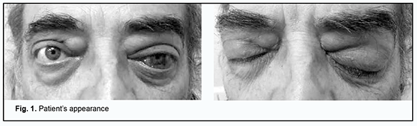 Biopsy was taken from the upper eyelid neoplasms by the oncologist in accordance with MRI-based and SD-OCT-based conclusions. Biopsy analysis demonstrated that the tumor cell morphology and the expression of antibodies by tumor cells corresponded to an extranodal B-cell lymphoma of the marginal zone (MALT lymphoma). Because of biopsy results, on May 29, 2018, the patient was hospitalized at the Podillia Regional Oncology Center with a preliminary diagnosis of orbital lymphoma. On January 1, 2019, computed tomography of the brain, chest and abdomen with intravenous contrast was performed, demonstrating reduced pneumatization of the left frontal sinus with a contrasted soft tissue component at the level of paranasal sinuses; apneumatosis of the right medial ethmoid labyrinth; and fluid with small air inclusions at the level of the right maxillary sinus. In addition, CT demonstrated a 32 x 14 mm elongated soft-tissue mass in the right medial orbit displacing the medial rectus laterally and a similar 25 x 13 mm mass in the left proximal orbit. It was concluded that there was CT evidence of a right maxillary sinusitis, ethmoiditis, focal changes in the left frontal sinus, orbits, lungs, and posterior mediastinum, likely as manifestations of the primary disease, a non-Hodgkin's lymphoma. On April 2, 2019, computed tomography of the brain and abdomen without intravenous contrast was performed, and it was concluded that there was no CT evidence of focal volume changes in the brain, but there was CT evidence of polysinusitis progression and regression of focal changes in the orbit and lungs. The patient was consulted by a department therapist. Therapist's opinion: coronary artery disease (atherosclerotic cardiosclerosis, heart failure 0 level), chronic pancreatitis in unstable remission, and osteochondrosis of the cervical spine. On June 15, 2019, multislice spiral computed tomography (MSCT) of the chest and abdomen with intravenous contrast was performed, demonstrating signs of secondary lesions of the lungs, pleura and lymph nodes of the mediastinum. The patient underwent inpatient surgery for removal of a soft tissue tumor of the right upper eyelid. Gross specimen description: The tumor, 2.0 cm in diameter, was round, hard and knobbly. The tumor when excised showed a thin wall and homogeneous structure, was pale pink and hard at touch. Histopathological conclusion: The tumor exhibited morphological findings and the pattern of antibody expression strongly suggestive of extranodal, non-Hodgkin’s B-cell lymphoma of the marginal zone (MALT lymphoma). Given the results of primary and adjunct methods of examination, a final diagnosis of “extranodal, non-Hodgkin’s B-cell lymphoma of the marginal zone (MALT lymphoma) of stage 3a, with stage 3 metastases in the lungs, pleura and lymph nodes of the mediastinum” was established. The secondary diagnosis was coronary artery disease (atherosclerotic cardiosclerosis, heart failure 0 level), chronic pancreatitis in unstable remission, and osteochondrosis of the cervical spine. A decision was made to administer a course of polychemotherapy. On March 11, 2019, the patient was re-admitted to the Podillia Regional Oncology Center (radiotherapy) for in-patient treatment with a diagnosis of “non-Hodgkin’s B-cell lymphoma of stage 3 and Clinical Group 3; coronary artery disease (atherosclerotic cardiosclerosis, heart failure 0 level) and chronic pancreatitis in remission”. He received brain radiotherapy (32 Gy) and 8 courses of polychemotherapy, and was discharged with recommendations for rehabilitation. The patient was followed up at the local otolaryngologist’s office and at the oncologist’s office at the Podillia Regional Oncology Center, Vinnytsia, and was recommended to have CT of the paranasal sinuses. Repeat CT of the paranasal sinuses performed on August 9, 2019, showed mild improvement (a reduced soft-tissue component at the level of the paranasal sinuses). In addition, the CT examination revealed no change in the bone defects of the medial wall of the right orbit. No visible pathological changes in the brain were observed. The patient was observed by the ophthalmologist throughout the course of treatment and attended follow-up appointments. He is stabilized at present with regard to ocular symptoms, has no ocular complaints. In addition, visible regression of eyelid tumors and exophthalmos is observed, and the position of the eyes is almost correct. At the moment, the patient is under observation by an oncologist and on the way to stabilization of his major disease. Discussion Management of orbital non-Hodgkin’s lymphomas remains a challenge requiring a multidisciplinary approach involving ophthalmologists and oncologists. The ophthalmologist is to detect the orbital neoplasm early and to perform its diagnostic evaluation, and the oncologist collects the material for morphological and immunohistochemical analysis. Patients with this pathology should be monitored by the ophthalmologist throughout the course of treatment to assess treatment effect. Such patients require lifetime monitoring to identify and prevent recurrence. Close cooperation of the ophthalmologist and the oncologist is important in the diagnostic evaluation of orbital tumor disorders and is a prerequisite for treatment success.
