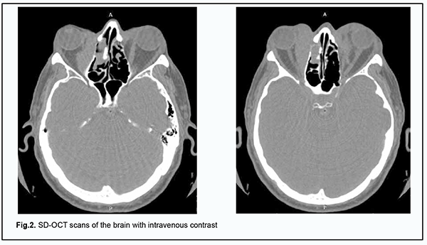 He was recommended to have a brain MRI with a focus on bilateral orbital imaging; spectral-domain optical coherence tomography (SD-OCT); and a complete blood cell (CBC) count. In addition, he was recommended to consult an endocrinologist and an oncologist. CBC results: hemoglobin (Hgb), 115 g/L; red blood cells (RBC), 4.2 х 106/mm3; white blood cells (WBC), 6.0 х 103/mm3; platelets, 2.4 х 105/mm3; percentage of bands, 3%; percentage of segmented neutrophils, 3%; percentage of eosinophils, 5%; percentage of eosinophils, 2%; percentage of lymphocytes, 25%, and RBC sedimentation rate, 17 mm/h. Blood: AB+ Rh positive. Blood biochemistry analysis: total blood protein, 74.6 g/L; urea, 6.4 mmol/L; creatinine, 88.0 µmol/L; total bilirubin, 21.6 µmol/L. Thyroid analysis: thyroid-stimulating hormone (TSH), 1.10 µU/ml; free thyroxine (FT4), 1.0 ng/div; anti-thyroid peroxidase antibodies, 0.9 U/ml. It was concluded that the patient had mild anemia and mild hyperbilirubinemia. On May 8, 2018, he underwent brain MRI at the Radiographic Imaging Department of the Vinnytsia Regional Clinical Hospital. Based on the results of MRI, the conclusion was as follows: Additional masses of unclear origin were noted in the superior and medial orbital cones. One cannot exclude changes in the muscles in the presence of changes in the thyroid gland and inflammation. It is likely that the neoplasms are in the presence of fibromatosis. Figure 2A, B shows SD-OCT scans of the brain with intravenous contrast.
