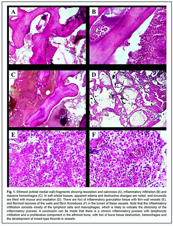 Introduction COVID-19-associated cavernous sinus thrombosis (CST) holds a special place among the eye diseases whose onset, course and outcome directly depend on COVID-19, since there is a significant increase in the prevalence of the COVID-19-associated CST in some global regions, which requires a comprehensive study of the disease to be conducted [1]. In addition, many questions regarding the pathogenesis of severe necrotic purulent lesions in the maxillofacial structures (e.g., the orbit) following the development of CST have not been answered yet. In this paper, we present the results of the pathomorpological study of the tissue obtained from a patient with COVID-19-associated CST complicated by the development of a severe necrotic purulent process in the orbit. The purpose of the study was to examine the pathomorpological features of the necrotic lesions in the orbital walls and soft tissues in COVID-19-associated CST. Case report A female patient, born in 1955, presented to the Department for the Treatment of COVID-19-associated Thrombovasculitis at the Multifield Clinic of Tashkent Medical Academy with complaints of severe pain in the right face, loss of sight in the right eye, blepharoptosis, apparent soft tissue edema in the right paraorbital area, general weakness, and elevated body temperature. Twenty-two days before presentation, she had been discharged from the hospital where she had been receiving specific therapy for severe COVID-19 and COVID-19-associated pneumonia with computer tomography (CT) evidence of the 2nd grade of lung involvement. She has type 2 diabetes of 12 years’ duration and receives insulin treatment. Right eye objective examination findings included apparent soft-tissue edema in the paraorbital region; chemosis; ptosis; 2nd grade exophthalmos; total ophthalmoplegia; decreased cutaneous sensation in the left paraorbital area; decreased corneal sensation; and anterior chamber hypopyon. In addition, ophthalmoscopy could not be accomplished due to hypopyon and vitritis. Multislice CT showed signs of right purulent pansinusitis with a lot of pus in the right maxillary sinus, destruction of the right ethmoid bone, and signs of the destruction of the right maxilla and hard palate. Magnetic resonance imaging (MRI; T2-TSE Dark Fluid protocol, 0.6-1.5-mm slices) findings included ophthalmic vein dilation; signs of parabulbar and retrobulbar fat edema and extraocular muscle edema; and expansion of the right cavernous sinus. Laboratory test results included: white blood cell count, 14.4 x 109/mm3; and erythrocyte sedimentation rate, 38 mm/h. Biochemical blood analyses included: C-reactive protein, 49 units; procalcitonin, 1.45 ng/ml; and ferritin, 650 µg/l. Blood coagulogram measurements included: activated partial thromboplastin time (APTT), 18 sec; fibrinogen, 580 g/l; and D-dimer, 1600 ng/ml. Based on the results of clinical and laboratory tests and imaging studies, the patient was clinically diagnosed with COVID-19-associated CST; panophthalmitis; periorbital cellulitis; right necrotic, purulent pansinusitis; and partial necrosis of the right maxilla and hard palate. The patient was administered preoperative conservative therapy to improve her clinical and laboratory parameters. This included continuous intravenous heparin infusion at a rate of 1500 IU/h every second day, with a target APTT value of ≥30 sec; Cefoperazone+Sulbactam 1.5 g, every other day; Metronidazole 100 ml intravenous infusion, twice a day; Fluconazole 100 ml intravenous infusion, every other day; Revmoxicam 2 ml intramuscularly, once a day; Neuromidin Revmoxicam 2 ml intramuscularly, once a day; Diacarb 200 mg, once a day; irrigation of the nasal cavity and paranasal sinuses with antiseptic solution, two to three times a day; Apdrops, two drops five times a day; and Nevanac, two drops three times a day. The therapy was given for 5 days. As a result, the stability of target parameter values was achieved, with a target APTT value of ≥30 sec, and twofold to threefold reduction in D-dimer, procalcitonin, and ferritin levels. It was decided to carry out a right orbital exenteration, right maxillary sinus surgery, and excision of the necrotic right hard palate and ethmoid bone. The conservative therapy was continued after surgery, and the patient stayed at the clinic, with daily irrigation of opened sinuses with antiseptic solution and application of a dressing for 12 days. An improvement in her condition was observed. The patient was discharged after stabilization of her general somatic status and relief of purulent inflammation. Further reconstructive surgical interventions were planned. Pathomorphological study The material (ethmoid and maxillary bone specimens and orbital soft tissue specimens) excised during surgery was sent for morphological examination. The material was fixed in 10% neutral buffer formaldehyde for 72 hours, rinsed with running water for at least two hours, dehydrated in ascending ethanol series and chloroform, and embedded in paraffine wax. The histological sections cut with a microtome were deparaffinized and dehydrated before staining them with hematoxylin and eosin. Results of Pathomorphological Study Specimens were analyzed for mucormycosis by microscopy using 10% potassium hydroxide (KOH) with Calcofluor white staining solution, and no rhizoid was found. Figure 1 shows photographs of the preparations and their descriptions.