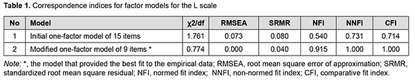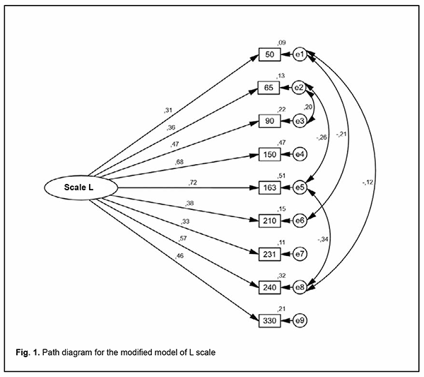 The absolute fit indices were moderate, but the relative fit indices were inadequate. In addition, absolute values of factor loadings of some items fell below a threshold of 0.300, which was unacceptable [14]. Therefore, these items (Nos. 65, 120, 180, 270, 300, and 360) were not indicators of a latent variable and had to be eliminated from the scale. We also used correlations between residual variances to fit the model to empirical data, and modification through permitting correlations between residual variances of contently related items Nos. 50 and 240, 50 and 163, 65 and 90, 65 and 163, 163 and 240 was performed and resulted in the modified model. The fit of the modified model (Table 1, Model 2) was significantly better than the original model, and the values of fitness indices were within the acceptable range. Figure 1 shows the path diagram for the modified model. The internal reliability of the 9-item scale was found to be high (Cronbach's α = 0.714). The list of items of the modified L scale is provided in the Appendix.