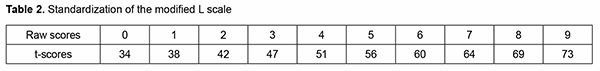Based on the fact that the study sample can be used as a scale standardization sample, and the norms calculated for the sample are representative for the individuals of relevant age and social status, we introduced the relevant test norms. Descriptive statistics for raw scores of the modified L scale were as follows: M = 3.713; Mdn = 4.000; SD = 2.269; IQR = 4.000; S = 0.020; K = -1.190. With all items of the scale reversed before analysis, raw scores of the modified L scale were translated to the standardized t-scores (Table 2).