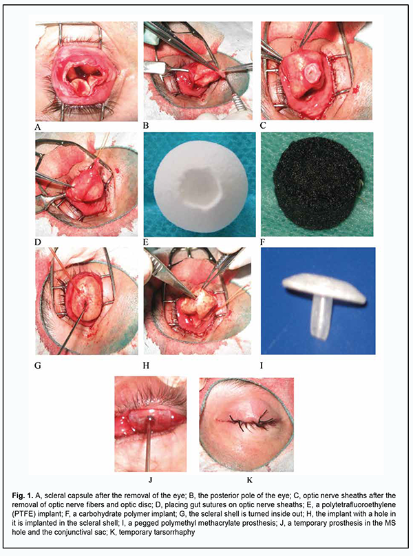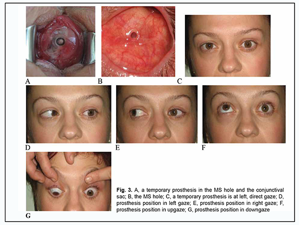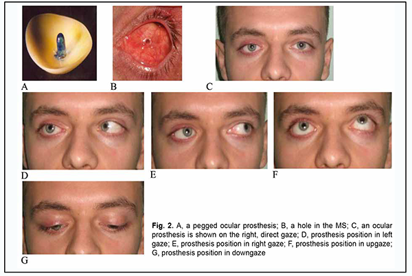 Therefore, in both study groups with a novel technique used for shaping an MS with a hole in it for a pegged prosthesis, patients had an improvement in the motility of the ocular prosthesis both early and late (3 months and 12 months, respectively) after surgery, which allowed for an improved cosmetic effect. Discussion The state and motility of the ocular prosthesis are essential in cosmetic ocular prosthetics [14, 19]. We have previously reported on developing a model of ocular prosthesis designed to be permanently fixed to the anterior surface of the MS with the aim to improve the cosmetic effect in ocular prosthetics in patients that underwent evisceration, improve prosthesis motility and prevent low lid ectropion resulting from prosthesis-induced pressure in the lower lid fornix [10]. This prosthesis attachment method enables good prosthesis mobility, but its disadvantage is the requirement for repeat surgical intervention in 4-5 years. Jordan proposed to couple a porous implant to the ocular prosthesis with a titanium peg system. However, this resulted in serious complications (e.g., infection of implant via peg channel) necessitating implant removal in 3.2% of cases [8, 11, 13]. Our clinical studies have demonstrated that the proposed method of shaping a hole for the pegged prosthesis at the expense of optic nerve sheaths prevented implant infection [21, 22]. The technique we developed for firm fixation of the ocular prosthesis to the stump after evisceration allowed improving total prosthesis motility in the four meridians at 3 months and 12 months after surgery to 132.50 ± 6.40 and 147.30 ± 6.70, respectively, versus 103.7±18.30 and 103.1 ± 6.00, respectively, in the controls. It is noteworthy that no implant exposure was observed with the implant placed in the scleral capsule after evisceration for chronic inflammation, enabling a conclusion that the scleral coat of the eye prevents an impairment of regeneration processes in the subconjunctiva and conjunctiva. In addition, in most patients, a stable effect in the shaped MS was observed at 12 months and 5 years after surgery, enabling a conclusion that the used implants have no tendency for resorption. An advantage of PTFE implants and polymer composite implants is that their shape can be corrected during surgery. Conclusion We developed methods of shaping a hole in the MS for the pegged ocular prosthesis with the help of either the optic nerve sheaths (after evisceration) or the conjunctiva (after enucleation); these methods can be used for enhancing the motility (and, consequently, the cosmetic effect) of the ocular prosthesis and preventing implant infection and exposure. We found that firm fixation of the pegged ocular prosthesis in the MS allowed improving total prosthesis motility in the four meridians at 3 months and 12 months after evisceration, by 28.8о and 44.2о, respectively, and at 3 months and 12 months after enucleation, by 35.5о and 38.5о, respectively.