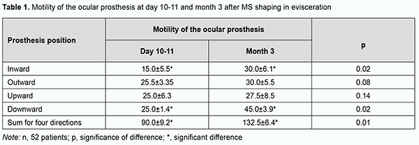 Our operative technique of enucleation and shaping a movable PTFE stump is described below. After an eyelid retractor is placed, 3.0 ml normal saline is injected subconjunctivally. The conjunctiva is incised along the limbus and dissected to the posterior pole of the globe, and the outer rectus muscles are sutured to the sclera and cut away from it. High-frequency electric current is used to dissect the optic nerve and the vascular plexus (ophthalmic artery and superior ophthalmic vein) [19]. After removal of the globe, an 18.0-19.0-mm PTFE implant with a 5x5 mm hole and loop-shaped gut suture No.2 at the hole is placed in a shaped cavity, with the free ends sutured through the wall of the hole to the outer and inner poles of the implant. The outer rectus muscles are secured to the implant at the equator at the 3, 6, 9 and 12 o’clock positions. Thereafter, a silk suture No.6.0 is placed centrally at the conjunctival margin and passed through the gut suture loop located in the hole of the implant. The upper margin of the conjunctiva is sutured and the knot is formed. The free ends of the gut suture are tightened which results in conjunctivalization of the wall of the implant hole. Gut sutures No. 1.5 are placed on the subconjunctiva, and knot sutures (silk sutures No. 6.0), on the conjunctiva. After disinfection eye drops are instilled, a PMMA mushroom-like model prosthesis is placed in the conjunctival sac, with its 3-mm-diameter and 5-mm-long peg inserted in the implant hole for 10 days to prevent tissue ingrowth of the hole. A temporary tarsorrhaphy is applied for 8 days, and a tight monocular bandage, for 3-4 days. The ocular prosthesis is implanted in the conjunctival sac at day 10 or day 11 [20]. In 3 months, shaping of the conjunctival sac is completed, and the permanent pegged prosthesis is fabricated for the patient. Clinical status of the orbital tissues and the results of cosmetic prosthesis were assessed based on the orbital tissue edema (presence or absence of conjunctival chemosis), wound healing (presence or absence of diastasis of the margins of the conjunctival wound), and total mobility of the ocular prosthesis. The functional outcome was assessed by the degree of motility of the ocular prosthesis using the Hirschberg test which reflects the reflex from the anterior surface of the ocular prosthesis with respect to the prosthesis portion simulating the limb of the healthy eye. Data are presented as mean and standard deviation. Results In group 1, a polymer composite implant was placed in the scleral capsule to shape an MS in 18 of 52 patients with chronic uveitis secondary to trauma and phthisis bulbi. In all these patients, moderate orbital edema and no conjunctival chemosis was noted, and a good conjunctival scar developed at day 8, which made it possible to remove sutures and proceed to prosthesis. In addition, no diastasis of wound margins with implant exposure was observed over follow-up. An Ekoflon PTFE implant was placed in the scleral capsule in 34 of 52 patients with chronic uveitis secondary to trauma and phthisis bulbi of group 1, with the postoperative period being not substantially different from that in those group 1 patients who received a polymer composite implant in the scleral capsule to shape an MS. The temporary ocular prosthesis was implanted in the conjunctival sac at day 10 or day 11 for 3 months, and patients were discharged with recommendations and followed by an oculist at their permanent places of residence. It is noteworthy that no complication such as orbital hemorrhage or hematoma, diastasis of the margins of the conjunctival wound, deformity of the conjunctival sac, or implant infection was observed in any patient of group 1. At the 3-month follow-up, a 3-mm diameter and 5-mm deep hole with completely epithelialized walls was seen on the anterior surface of the MS in all patients of group 1. No implant exposure was observed over the follow-up period. Prosthesis motility was assessed at day 10 or day 11 and at month 3 (Table 1).