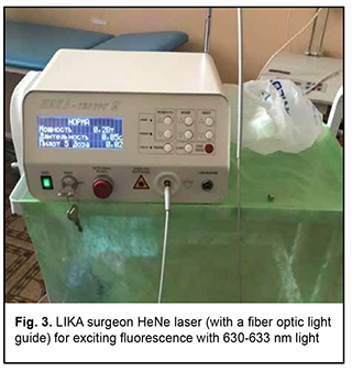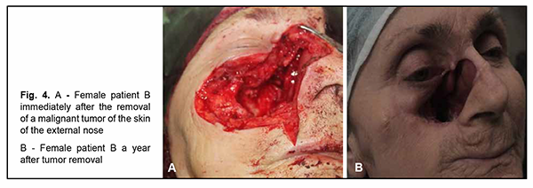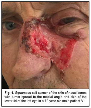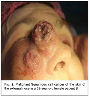 Introduction Malignancies are an important medical, biological, social and economic problem globally and particularly in Ukraine. In 2012, superficial head and neck cancer was the most common type of oncological disease in Ukraine, accounting for 10.3% of all oncological cases. The estimate of annual incidence of superficial head and neck cancer in Ukraine is 44.5 cases per 100,000 population [1, 2, 3]. In recent years, there has been an increase in the global incidence of superficial epithelial malignancies, particularly, basal cell carcinoma and squamous cell skin carcinoma, the two most common carcinomas of the head [4, 5], with the incidence of newly diagnosed cases per year of about 100 per 100,000 population [1, 2, 3, 6, 7, 8, 9]. Because topical and differential diagnosis of chronic (pre-cancer) conditions (actinic keratosis, Bowen’s disease and cancer in situ) is rather difficult, the diagnosis of nasal skin cancer is a challenge, although clinical symptoms in the form of changes in the color and size of the neoplasm can be early observed [4, 10, 11, 12]. The diagnostic assessment of superficial head tumors is important, because late diagnosis of nasal skin cancer results in tumor spread to the skin of the medial angle of the eye and lower eyelid, making the surgical treatment more difficult and worsening the quality of life. Unfortunately, patients do not seek care early in their illness, although early clinical signs of the tumor can give evidence of the aggressiveness of the process [1, 2, 5, 9, 13, 14, 15, 16]. Consequently, in the presence of a superficial skin tumor of the external nose with signs of malignancy, the morphological type of the lesion should be promptly identified, and the lesion should be treated with a radical approach to prevent tumor spread to the ocular tissue and face. There are two morphology-based methods of malignant skin tumor removal: the first is image-guided skin tumor removal taking in account the coefficient of radicality, and the second is Mohs micrographic surgery, a technique for excision and analysis of skin cancers employed by specially trained dermatologists. The Mohs procedure involves surgically removing skin cancer layer by layer and examining the tissue under a microscope until healthy, cancer-free tissue around the tumor is reached. The main advantage of Mohs surgery is that it offers precise microscopic control of the entire tumor margin while maximizing conservation of healthy tissue. In our opinion, Mohs micrographic surgery is more appropriate for the removal of tumors of the trunk, in which there is a possibility for tissue mobilization with a retreat from the tumor taking in account the coefficient of radicality, and using surrounding tissues for defect closure. In addition, Mohs micrographic surgery requires a specially trained dermatologist and more time for performing additional morphological studies to avoid surgical failure in the form of facial deformities. Taken together, the above confirms the importance of developing an advanced method for preoperative objective visualization of skin cancer lesion margins in radical tumor removal surgery [2, 3, 4, 10]. Fluorescence imaging is currently the most effective high-quality technique for visualization of cancer lesion margins and widely used by dermatologists and oncosurgeons in photodynamic therapy and tumor removal surgery. Chlorin E6 is a photosensitizer authorized in Ukraine, and we used chlorin E6 fluorescence imaging in the surgical removal of cancer lesions of the external nose and ear. The purpose of the study was to assess the diagnostic information value of chlorin E6 fluorescence visualization of cancer lesion margins in the radical removal of malignant lesions of the external nose. Material and Methods Thirty patients (13 women and 17 men) with skin cancer tumors of the external nose were examined, treated and followed at the department for ear, nose and throat cancer of Odesa municipal clinical hospital No. 11 during 2017 to 2020 and were involved in the study. Their age ranged from 55 to 75 years. Patients were divided into two groups of 15 patients each depending on the type of tumor growth and the method used for objective visualization of the cancer lesion margins in the removal of lesions of the external nose. Group 1 was composed of 15 patients with exophytic skin lesions of the external nose that underwent tumor removal within healthy tissue margins without fluorescence visualization. Tumor lesion size ranged from 1-3 to 8-10 cm (Figs 1, 2). Group 2 was composed of 15 patients with endophytic and infiltrating skin lesions of the external nose with lesion size ranging from 2-3 to 8 cm. Patients underwent a comprehensive clinical study (dermatoscopy, morphological examination, differential thermal analysis, and clinical tests), and duration of skin lesions and changes in lesion color, size and/or shape were assessed. In addition, they were consulted by a dermatologist. For control purposes, surgical tumor removal was accompanied by fast histological assessment of resection margins. The duration of surgery was 60 minutes, and the duration of fast histological assessment, 20 minutes. In group 1, the tumor with 1.2-1.5 cm- healthy margins was surgically excised, with fast histological assessment showing the absence of malignant cells in resection margins. Resection depth was determined visually. In group 2, ce6 was used for fluorescence imaging of tumor lesion margin, with ce6 randomly accumulated in tumor tissue. The photosensitizer was injected into tumor lesions at a dose of 1.0-3.0 μmg/kg within 3-5 minutes, and the result was assessed in 50 to 60 minutes. Five minutes prior to surgery, Klein solution (a mixture of 1% Lidocaine and 2-3 drops of Adrenaline) was injected under the base of the tumor to prevent intraoperative tumor metastasis and hemostasis. The amount of Klein solution injected depended on the area of tumor lesion, with an average amount ran