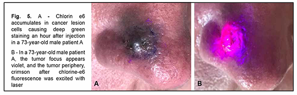 Deep green staining of the tumor was seen, clearly showing tumor lesion margins, 50 to 60 minutes after injection of chlorin e6 in tumor tissue (Fig. 5A).