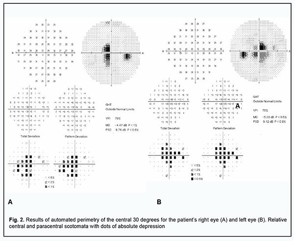 The uncorrected visual acuity OS was 0.1 but corrected to 0.35 with 3.0 D of sphere. The anterior segment OS was unremarkable. Dispersed suspended solid particles were seen in the preretinal vitreous space. The optic disk OS was pale pink with sharp margins. The retinal arterioles were tortuous, but the arteriolar caliber was normal. In the posterior segment, there were yellow-white, cream-colored or pink lesions with poorly defined borders and small edema close to the lesions (Fig. 1B). Retinal pigment epithelial and neuroepithelial detachments were present in the macula and along the superior temporal arcade. The peripheral fundus was unremarkable. The visual fields showed enlargement of the blind spots and isolated relative central and paracentral scotomata (Fig. 2).