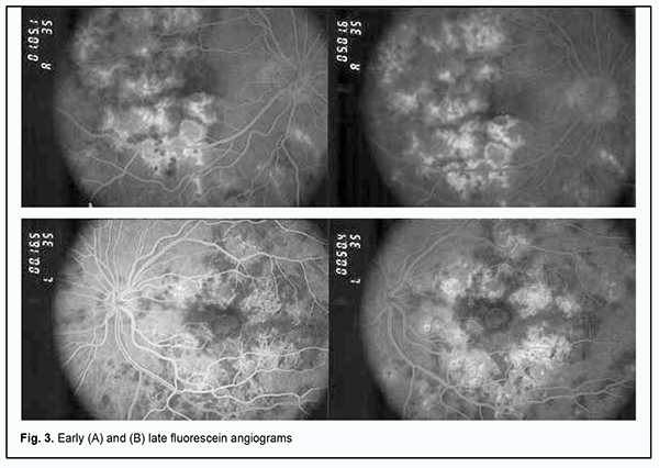 Lesions in both eyes showed hypofluorescence in the early phases of FA. The degree of hypofluorescence gradually increased with time, with the formation of areas of RPE atrophy with mildly redistributed pigment, and lesions of various severities observed in the fundus (Fig. 3A).