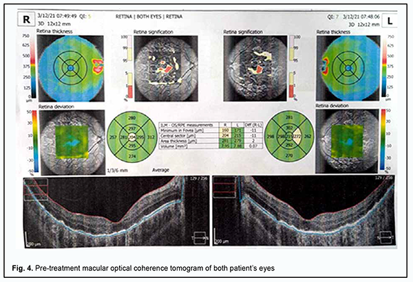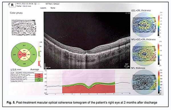 Mean pattern visual evoked potential (PVEP) P100 amplitude for a 1-degree check size was 4.8 μV in the right eye and 5.6 μV in the left eye, which was about half of normal amplitude, and PVEP P100 latency ranged from 128 ms to 132 ms, which was 30% longer than normal latency. Mean pattern visual evoked potential (PVEP) P100 amplitude for a 15-minute check size was 5.0 μV in the right eye and left eye, which was about half of normal amplitude, with PVEP P100 latency of 106 ms and 120 ms for the left and right eyes, respectively. These data demonstrate abnormalities in the right and left visual pathways, which was confirmed by 60% and 20% reductions in flash VEP amplitudes and 15% and 28% prolongations in flash VEP latencies in the right eye and left eye, respectively. Scotopic electroretinograms (ERG’s) were normal. In the maximal ERG, the a-wave represents the function of the peripheral photoreceptors and was normal. In addition, the b-wave is the measure of the activity of peripheral bipolar cells and Müller cells, and showed a 20% reduction in amplitude from normal and normal latency. The photopic ERG reflects mostly central retinal activity. The photopic ERG b-wave showed 15-20% latency prolongations and 20% amplitude reductions in both eyes, reflecting a decreased functional activity of the bipolar cells and Müller cells of the central retina. The ophthalmic rheography study showed 30% and 18% reductions in RQ (‰) in the right eye and left eye, respectively, and moderately increased vascular tones in large-caliber vessels. The patient was diagnosed with a bilateral acute posterior multifocal placoid pigment epitheliopathy and moderate myopia based on the clinical symptoms and imaging studies. She was administered 10 sessions of transorbital electrophoresis with Azyter®, non-steroidal anti-inflammatory and antiviral drugs, and vascular and metabolic therapy. Associations of APMPPE with autoimmune and autoinflammatory disorders have been reported [7, 10, 17, 18]. Therefore, antibacterial therapy was administered due to findings of bilateral retinal inflammation. At discharge (treatment day 10), the patient noted an improvement in vision, and her visual acuity with correction was 0.5 OD and 0.4 OS. One month later, she had no complaints of vision loss, and her visual acuity with correction was 0.8 OD and 0.85 OS. On eye examination in both eyes, the anterior segment was unremarkable and the media were transparent. The optic disk was pale pink with sharp margins. Ophthalmoscopy showed polymorphic lesions with significantly reduced edema adjacent to them in the posterior segment. The peripheral fundus was unremarkable. The patient was taking Nutrof® Forte (a dietary supplement containing vitamins, antioxidants, lutein, zeaxanthin, omega-3 fatty acids, and Vitis Vinifera extract (Resveratrol)) for a month. She missed scheduled follow-up visits to the institute, but was examined by a local ophthalmologist two months after discharge. Her visual acuity when corrected with -3.0 D of sphere improved to 0.9 in the right eye and 1.0 in the left eye. The visual fields showed no relative scotoma. The patient showed OCT evidence of improved APMPPE (Fig. 5) with treatment with anti-inflammatory, vascular and metabolic drugs.