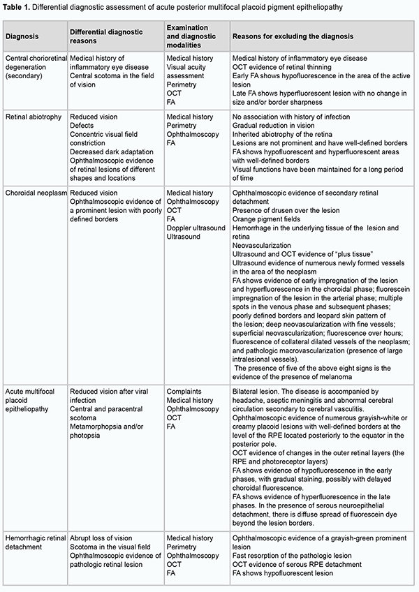 Background: Acute posterior multifocal placoid pigment epitheliopathy (APMPPE) is a rare inflammatory disease, and the differential diagnostic assessment is essential for its adequate treatment. Purpose: To perform clinical analysis and differential diagnosis for a case of APMPPE. Material and Methods: We present a case of a 26-year-old woman with APMPPE. The patient underwent an eye examination which included visual acuity assessment, refractometry, tonometry, perimetry, biomicroscopy, direct and indirect ophthalmoscopy, optical coherence tomography (OCT), fundus photography, and fluorescein angiography (FA). Endonasal electrophoresis was conducted in a routine manner using azithromycin, a macrolide antibiotic. Results: OCT found numerous flat yellowish-white and grey-pink lesions in the posterior pole of the fundus at the level of the retinal pigment epithelium and choriocapillary layers. FA showed irregularly shaped non-fluorescent lesions, which began to exhibit faint fluorescence a few minutes after the dye injection. The differential diagnosis should include serpiginous choroiditis, Vogt-Koyanagi-Harada syndrome, geographical choroiditis, acute retinal pigment epitheliitis (Krill disease), and choroidal neoplasm. Conclusion: Acute posterior multifocal placoid pigment epitheliopathy is an acute-onset disease. If the disease is suspected, a thorough history is essential, and the differential diagnosis should be performed for early treatment and referral to an appropriate specialist. Patients with this disease should be followed since recurrences can occur. Keywords: acuteposterior multifocal placoid pigment epitheliopathy, differential diagnosis, treatment
