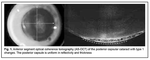 Introduction Cataract surgery is one of the most efficient methods of treatment in the history of medicine, and its hardware, instruments and techniques have been continuously improved in recent decades. It is this that contributes to a prompt restoration of visual functions in cataract patients and enables them going back to their routine daily activities and restoring their quality of life [1]. Planning for and decision making in phacoemulsification (phaco) is a comprehensive and responsible activity aimed at improving the efficacy and safety of the method with regard to surgical complications. This is especially related to non-standard or complicated cases involving a small-pupil syndrome, pseudoexfoliation (exfoliation syndrome), ocular hypertension or lens subluxation. The surgical techniques for and preventive measures against these pathological conditions have been widely reported in the literature [2, 3, 4]. This improves the surgeon’s confidence and readiness for timely decision making in unexpected situations during phaco surgery. In addition, the type of cataract (nuclear, cortical, subcapsular, posterior capsular, etc.) at baseline should be taken into account, because each type has certain features and is characterized by certain pathological lens changes which can influence treatment time and complication development [5, 6]. However, the presence of changes in the posterior subcapsular layers and posterior capsule do not always receive proper focus in routine daily practice. Cases may differ in the cause of the development and pathogenesis of lens opacity in the posterior capsular cataract (PCC). PCC can be either congenital or acquired. Age-related lens changes can mask the clinical appearance of congenital PCCs in older patients, whereas acquired PCCs usually form in the presence of changes in the body, systemic diseases (long-time administration of steroids), or eye disease (history of vitrectomy, etc.) [7, 8, 9]. PCCs result in a more substantial vision loss already in early disease stages and are more frequently found in young individuals compared to other types of cataracts. In addition, studies have reported that cumulative 5-year progression rates and incidences of surgery were higher for PCC than for other types of cataract [5, 10]. Therefore, it is reasonable to optimize the diagnostic and surgical activities for faster visual rehabilitation of patients with PCC. PCC surgery can be challenging due to various clinical situations. Therefore, it is important to comprehensively assess all changes in the morphology of the anterior and posterior segments of the eye before surgery, in order to timely use the departures from the stages of phaco, and thus facilitate the avoidance of surgical complications. It is this problem that the paper seeks to address. The purpose of the study was to investigate morphological OCT changes in the posterior lens capsule in posterior capsular cataract, and to assess their value in the optimization of phaco for these cataracts. Material and Methods This study was conducted from 2020 until 2022, and 1200 patients (1780 eyes) requiring cataract surgery were examined within the framework of the study. Five hundred and twelve (28.8%) of 1780 eyes were diagnosed with PCC. Informed consent was obtained from all patients participating in the study. The study was approved by the local ethics committee and has been performed in accordance with the ethical standards laid down in the Declaration of Helsinki. Preoperative best-corrected visual acuity (BCVA) ranged from 0.02 to 0.3 (Sivtsev chart). Preoperatively, a general eye examination (BCVA, perimetry, tonometry, biomicroscopy, ophthalmoscopy, and ocular biometry) and biochemical tests were conducted as per the relevant protocols. Optical coherence tomography (OCT) was conducted in eyes with PCC to identify morphological changes in the anterior and posterior segments of the eye, and study groups were formed based on the changes identified in the eyes. OCT was performed in mydriasis with a Optovue RTVue 100 XR Avanti (Optovue Inc, Fremont, CA) using Line and CrossLine scans (high-definition B scans), and 3D Cornea scans. We performed horizontal and vertical scans focusing on the posterior capsule of the lens and showing also the core of the lens and the retrolenticular space. A portion of the lens nucleus and the anterior hyaloid membrane were also seen in some of the scans performed. Additional scans focusing on the anterior capsule of the lens were performed in case of changes in the most anterior lens. 3D Cornea scans made it possible to examine a 4x4 mm field and capture the entire or most of the opacity. OCT images of the posterior lens capsule and opacity were analyzed, the relationship of the posterior lens capsule and lens opacity was examined and the state of the retrolenticular space was assessed. If the major opacity was adjacent to the posterior capsule and the latter was difficult to assess, we tried to improve the visualization of better reflective structures. With this in mind, contrast settings were changed, allowing enhancing the visualization of denser structures and assessing the capsule margin more accurately. Each OCT image initially obtained with standard OCT settings was assessed by two independent experts. If there was a discrepancy between the two experts, “hyperdiagnosis” (i.e., predicting worse morphological changes in the lens) was given an advantage. Surgery was performed by one experienced surgeon. This facilitated (1) more accurate distribution among the groups based on the morphological changes in the lens, and (2) the prevention of perioperative iratrogenic complications. Surgery consisted of multimodal anesthesia and ultrasound phaco combined with artificial lens implantation. For phacoemulsification, the Alcon Infiniti Vision System (Alcon, Fort Worth, TX, USA) was used in conjunction with a 45-degree Kelman 0.9-mm mini-flared tip. The efficacy measure was t