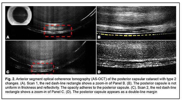 In group 3 comprising 3% (15) of the study eyes, the posterior capsule was either not clearly visualized due to hyperreflective lesion or bulged into the retrolenticular space (indicating a possible defect in or disintegration of the posterior capsule) and there was a fibrous cord. These changes in the PLC were defined as type 3 morphological changes (Fig. 3).