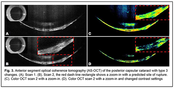 Hydrodissection, hydrodelineation and ordinary phaco were performed in all cases with type 1 morphological AS-OCT changes (i.e., no AS-OCT evidence of close interrelationship of the posterior capsule with the surrounding structures). The nucleus and subcapsular layers were removed sparing the capsule using low irrigation and aspiration flow to reduce the pressure on the capsule and, consequently, to preserve capsular integrity, only in 88 eyes (28%). Additional polishing of the posterior capsule was used in 12 eyes (3.8%). As a result of sequential measures employed, no perioperative complications were observed. A strong attachment of the posterior cortical layers to an altered lens capsule in cases with type 2 morphological OCT changes gave grounds for the following measures: refraining from hydrodissection in 95.1% of cases and performing complete hydrodelineation in all cases; and using low irrigation and aspiration flow to remove the nucleus in 97% of cases and posterior capsule polishing in all cases. This facilitated avoiding perioperative complications. However, posterior capsular changes in the form of opacification regions of various opacity severity score and area were noted in all cases, which required postoperative laser treatment. Because type 3 morphological OCT changes in PLC indicate potential loss of posterior capsular support (i.e., degeneration or loss of integrity of the PLC), preserving the PLC during phacoemulsification was a challenge. In some patients, viscodissection was used to carefully separate the peripheral lens cortex and epinucleus from the compromised capsule. In addition, contrary to cases with type 2 morphological OCT changes in PLC, posterior capsule polishing was not used because we believed that it was not reasonable and unsafe given the state of the capsule in cases with type 3 morphological OCT changes. Moreover, posterior capsular rupture was seen in half of cases with type 3 morphological OCT changes (particularly, posterior capsular rupture without vitreous prolapse was seen in 33%, and surgery was combined with vitrectomy in 20% of cases), and the rest showed opacification, which required laser discision. Therefore, a preoperative understanding of AS-OCT morphological changes in PLC substantially facilitates planning PCC surgery and avoiding potential perioperative complications. Discussion Intracapsular complications in the form of posterior capsular tear and partial loss of vitreous are common in patients undergoing PCC surgery. Osher and colleagues [11] and Vasavada and Singh [12] performed phacoemulsification on posterior polar cataracts and reported on a posterior capsular rupture rate of 26% and 36%, respectively. In a study by Hayashi and colleagues [13], medical records of 28 eyes of 20 consecutive patients with posterior polar cataract who had cataract surgery were reviewed. Of the 28 eyes, 25 (89.3%) with a small to medium posterior polar opacity had standard phacoemulsification or aspiration surgery. Among the eyes having phacoemulsification or aspiration surgery, posterior capsule rupture occurred in 2 (7.1%). In the current study, we paid attention to the features of lens opacities, optimized phaco stages in PCC surgery, and found an intraoperative complication rate of 1.5%, with half of intraoperative complications related to type 3 morphological OCT changes in PLC. In order to reduce the rate of posterior capsular rupture, others have given attention to (1) diagnostic measures aiming to identify the features of lens opacities which can cause such complications and (2) optimization of surgical cataract removal. Kumar and colleagues [14] used biomicroscopy to study the effect of size of the posterior polar opacity on surgical outcome of phacoemulsification in posterior polar cataract. Consecutive patients with posterior polar cataract who underwent phacoemulsification were analyzed for intraoperative complications. The rate of intraoperative posterior capsule rupture was higher in eyes with polar opacities 4 mm or more than in eyes with less than 4 mm size (30.43% versus 5.71%, respectively). Kumar and colleagues concluded that phacoemulsification in eyes with larger size of polar opacity has significant risk of posterior capsule rupture. Guo and colleagues [15] were the first to report the application of 25MHz B-Scan ultrasonography (MHzB) to distinguish between the integrity and non-integrity (dehiscence) of the posterior capsule in posterior polar cataract. The authors concluded that the results of the study could be used to select the appropriate treatment and to thereby avoid further complications during posterior polar cataract surgery. Since 2014, there have been reports on the use of AS-OCT for (1) determining whether the posterior capsule is intact or there is a pre-existing posterior capsule defect or (2) assessing the adhesion of the capsule to the posterior polar opacity and subsequently determining the eyes at high risk for posterior capsule rupture (i.e., perioperative complications) [16, 17, 18]. In the current study, we also used AS-OCT, but, contrary to previous relevant AS-OCT studies, changed contrast settings to exclude less reflective morphological structures. This significantly improved our understanding of the morphological changes in the lens (particularly, (1) the state, integrity and transparency of the posterior capsule, or (2) opacity location, relation with the capsule, density and extension, and (3) the state of the retrolenticular space and the posterior hyaloid membrane) in patients with PCC. In addition to the advances in the diagnostic methods that facilitate determining the risks of posterior capsular rupture, and, consequently, reducing the rate of perioperative complications in patients with PCC, there have been advances in the surgical methods with the same purpose. Various techniques and preventive measures for minimizing the risk of posterior capsular rupture during phaco in patients with PCC