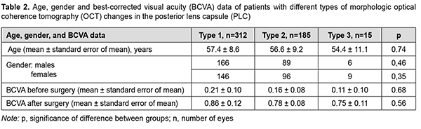 The distribution of patients by the type of morphological changes in the posterior lens capsule is shown in Table 1.