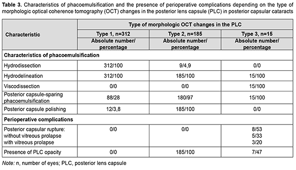 Morphological OCT changes in PCC did not depend on patient’s demographic data (Table 2). The posterior capsular cataracts received surgical treatment which depended on the identified OCT structural changes in the PCC and involved some departures from the standardized phaco stages. Characteristics of the phaco techniques and relevant perioperative complications were summarized for the identified types of morphological changes in PCC (Table 3).