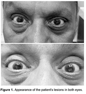 Physical examination revealed visual acuity of RE: 20/80 and OS 20/100 with better corrected visual acuity (BCVA) of OD: 20/50 (+ 0.50 / -1.00x180 °) and OS: 20/80 (+ 0.50 / -1.00x180 °). Biomicroscopy revealed multiple whitish intrastromal macules that are accentuated in greater quantity in the central 5 mm of the cornea, a wide anterior chamber, a reflective pupil and a transparent lens. Eye strain is reported as 16 mm Hg. (Figure 2)