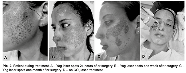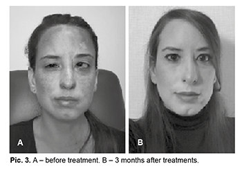 The patient was followed up with four monthly CO2 laser sessions in the nevus area. This allowed effacement of the nevus in 90% of its extension. A satisfactory result was obtained, expressed by the patient herself (Pic. 3).